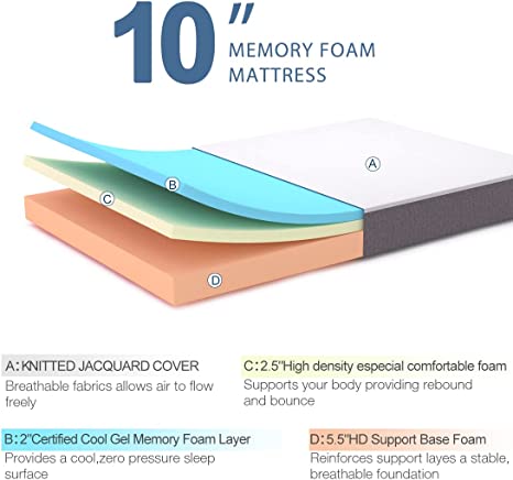 Description: Hybrid memory foam mattress with high Permeability. It contains 4D knitted dual-layer cover that allows the mattress to breath freely, creating a dry, restful sleep. Also, the Coil system permits additional airflow. Mattress comes support system. The tempered steel coil system provides powerful support to each part of your body (Feet, legs, hips, waist, shoulders, neck, head), catering your vertebral well. Tightly knit edges and reinforced foam maximize edge support. The mattress features individually wrapped coils. These individually wrapped coils innerspring is supported by hundreds of individual pocket springs, which is durable in use. Memory foam with 4D soft knitted fabric on the top increase its comfort level. The mattress is certified safe: Mattresses are certified by CertiPUR-US, ISPA and Oeko-Tex Standard 101 without harmful substances like formaldehyde, mercury, and other heavy metals, ensuring a no concern sleep. There is easy shipping & set-up service available with the mattress. The mattress is compressed and packaged in a box for shipping, allowing it to easily be delivered to your door and expand to its full lofty shape inside your home.