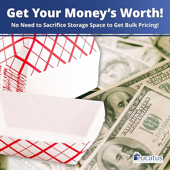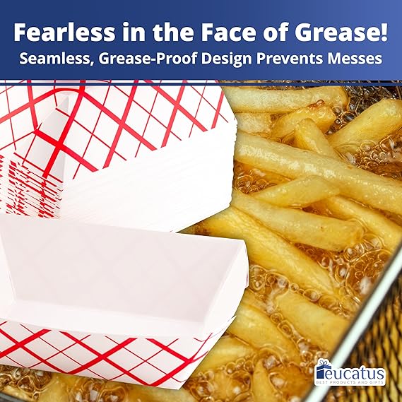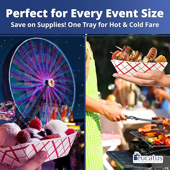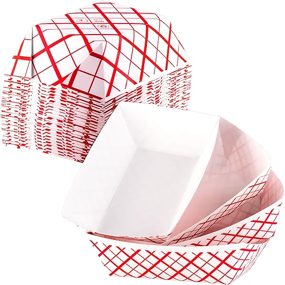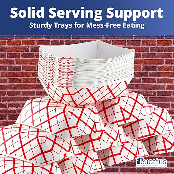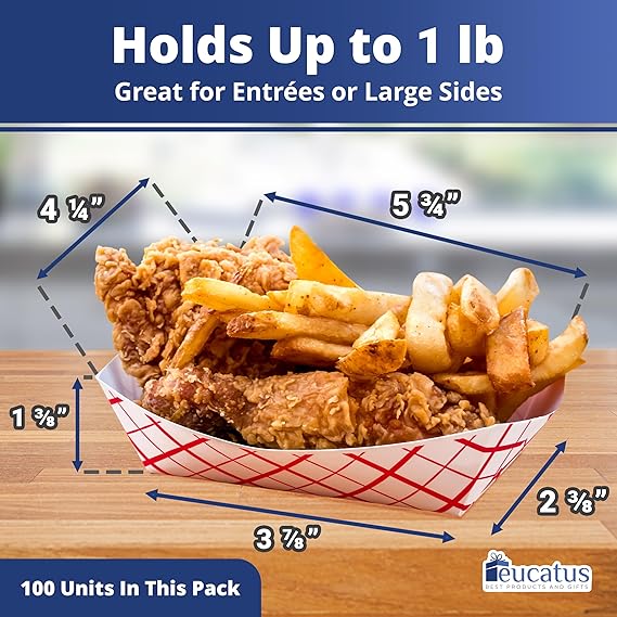 • Description: These are Sturdy Trays for Mess-Free Eating. Feel free to pile on huge servings of tasty foods without fear of collapse! Our paperboard food trays are built seam-free and hold up to 1 lb of food with ease. These food trays are Grease Proof Coating which means there is No Leaking! Save your guests or customers from grease stains with our sturdy, leak-proof food trays. Serve fried or saucy foods with confidence! Trays come with Lifetime money back guarantee! We stand behind our concession stand and trays all of our products. If you’re not 100% COMPLETELY SATISFIED, just send us an email, and we promise to make it right! Save Money and Save Money and Space with Bulk Packs. Don’t waste storage space or money buying more trays than you really need! Our 100 pack is perfect for backyard parties, church socials, or school carnivals. Ideal For Fundraiser Food. Need a food boat for banana splits? Done. Need a basket for hot dogs? Done. Our restaurant-grade trays are perfect for any hot or cold festival foods you want to serve.