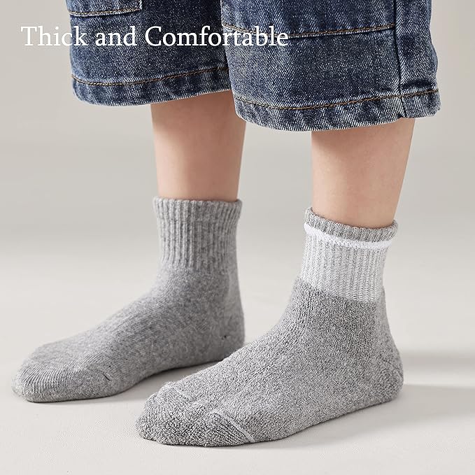 Description: High-quality kids crew socks that are made with combed cotton. The thick and soft material protects kid’s feet well. Kids crew socks are very breathable, kids won’t feel uncomfortable due to sweating, they can enjoy the joy of exercise all the time. These crew socks feature ribbed cuffs and full cushion sole. Ribbed cuffs help keep your little one’s socks in place. Another feature is Y-heel and Full cushion soft towel fabrics that suit ultimate support in any work boot or shoe. An Arch band provides a supportive feel. Reinforced heel and toe for durability. Designed for occasional wear, whether walking, running or playing, these socks make it easier and more comfortable for kids to move around. The simple and classic design also makes it match well with different styles of clothes and shoes.
