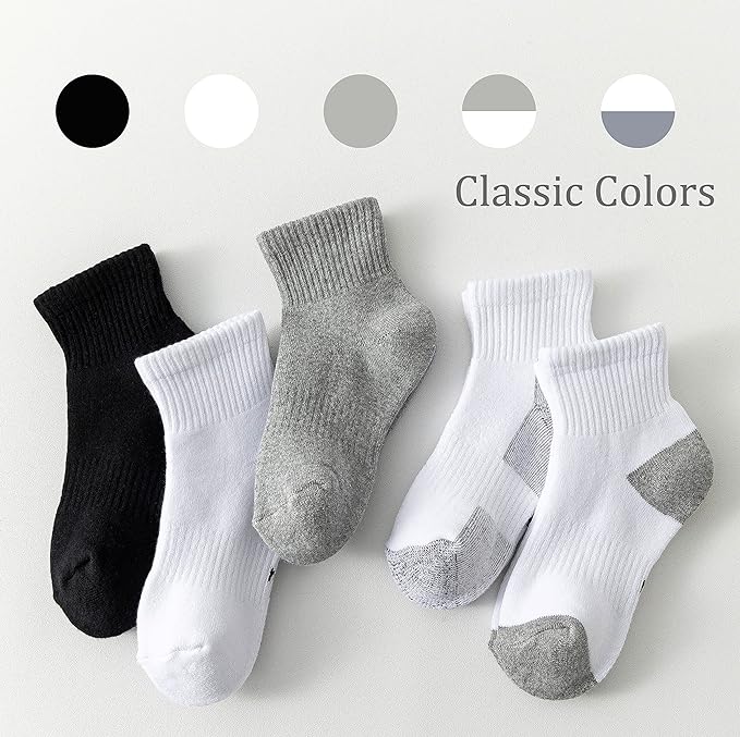 • Description: High-quality kids crew socks that are made with combed cotton.  The thick and soft material protects kid’s feet well.  Kids crew socks are very breathable, kids won’t feel uncomfortable due to sweating, they can enjoy the joy of exercise all the time. These crew socks feature ribbed cuffs and full cushion sole.  Ribbed cuffs help keep your little one’s socks in place. Another feature is Y-heel and Full cushion soft towel fabrics that suit ultimate support in any work boot or shoe. An Arch band provides a supportive feel. Reinforced heel and toe for durability. Designed for occasional wear, whether walking, running or playing, these socks make it easier and more comfortable for kids to move around. The simple and classic design also makes it match well with different styles of clothes and shoes.