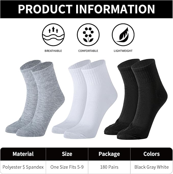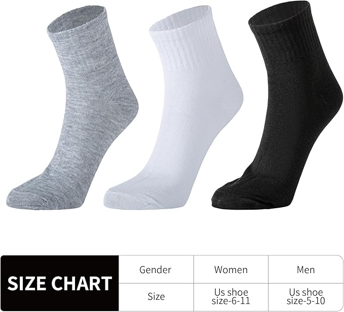 • Description: These set of socks were designed in simple and classic solid colors, easy to match a variety of styles of shoes such as running shoes, sneakers, boots and f lats.size 9-11,fits most men and women. This value set iincludes 3 pairs of quarter socks, 1pair ein black, white and gray for cheap price. Now you are able to buy enough quantity to meet your daily wear, replacement and sharing needs.