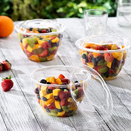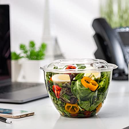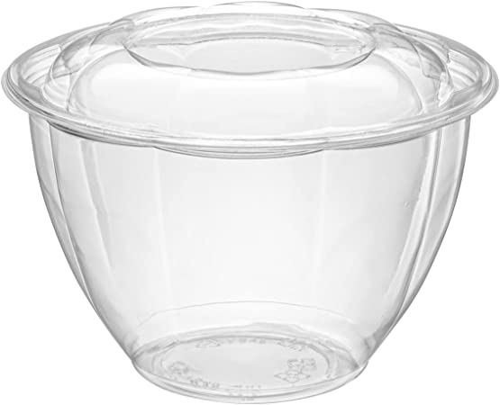 Description: 50 sets of 32 oz. Comfy Package Crystal Clear Plastic Salad Bowls with Extreme-Airtight Lids – a must for restaurant and catering take-out foods mentioned below, great food storage or good for meal planning with or without portion control.Extreme-Airtight Lids: Perfect-fitting overlapping lids which preserves freshness and avoids leakage. High-quality – Ultra-clear durable PET material plastic food containers & lids. People Friendly – Does not absorb liquid and is crack-resistant, which makes it a great choice for adults and kids. Elegant Look – Rose-shaped and crystal clear adds an upscale feel and appearance.
