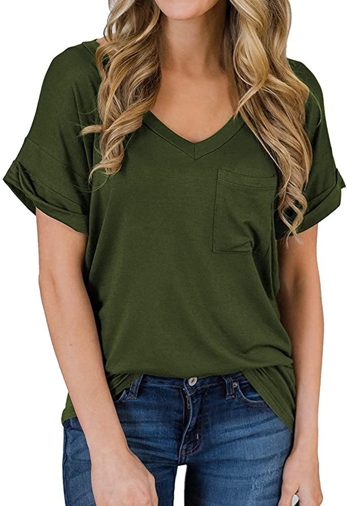 T-shirt V-Neck Pocket Short Sleeve with Loose fit slim cutting, elegant and chic, flattering top