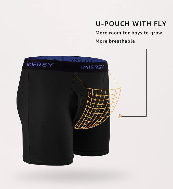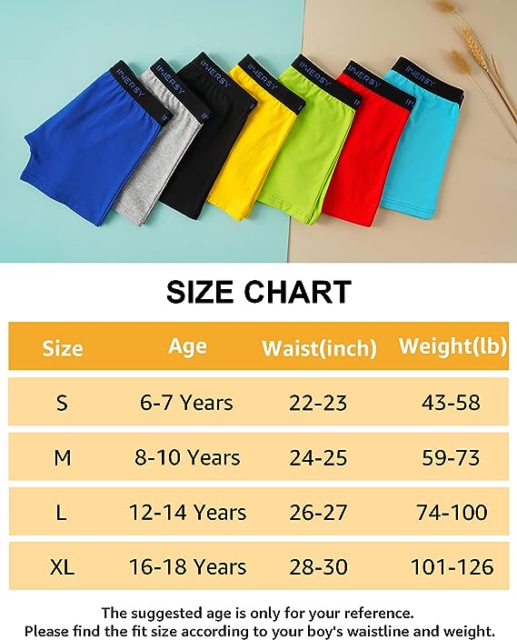 Description: Stretchy waistband: 95% Cotton, 5% Spandex. The waistband is nicely stretchy and stays in place all the time. The boys’ boxers are comfortable to wear with no roll up or roll down, making boys comfortable all the day. There is no discomfort or scratchy feeling with the tag-free design. Find suitable size: Our boys’ underwear is for teen boys aged 6-18. The suggested age is only for your reference. Please find the fit size according to the waist size and weight in the size chart. Comfy in activities: The boys boxer briefs provide stretchy comfort and good breathability, which helps a lot of boys who are in sports or outdoor activities. The elastic waistband is easy to put on or take off. No ride up, no-binding leg openings, boys will feel more freely. Pouch Design: U-type flying pouch of the boxer provides enough space for teen boys to grow and offers more protection and freedom. Great gift for a family: Comfy boxer shorts with various colors can be a nice gift for your son or grandson.