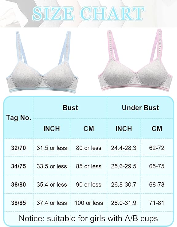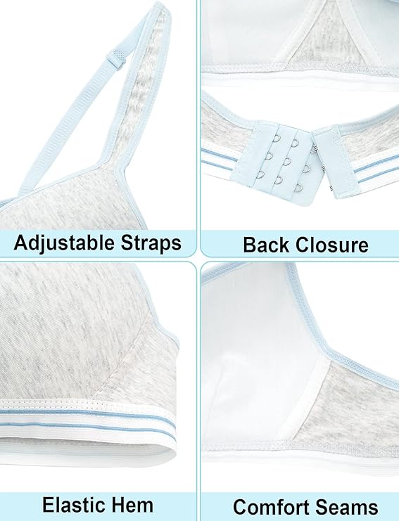 Description: Comfortable & Skin-Friendly: Our teen bras are made from soft, breathable fabric that won’t irritate a girl’s delicate skin. Designed to keep them cool and dry all day, even during various activities. Adjustable for a Secure Fit: Our big girls’ bras feature 3 adjustable hooks and eye closures, and adjustable shoulder straps, ensuring a comfortable and secure fit for growing girls during their developmental stages. Seamless Support & Protection: Our seamless sports bras offer perfect support and shock reduction during physical activities, safeguarding developing breasts without causing excessive pressure or constriction. Perfect for Young Teens: Upgrade your daughter’s sports or training bra with our range, available in sizes 32A, 34A, 36A, and 38A. Ideal for girls aged 10-12, 12-14, 14-16, and 16-18 years old. Confidence & Comfort: Our bras are designed to help ease discomfort and boost confidence for teens experiencing rapid physical growth. The breathable, super soft cotton ensures a comfortable and carefree day.