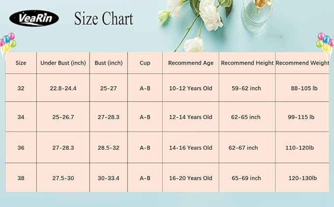 Description: The inside of the cup lined in cotton,they are comfy and stay in place and the pads cover nipples well. Great as a step up from a sports bra or training starter bra for the young teenager! Available Size are 32A Bras, 34A Bra, and 36A Bras. Bras for girls 10-12, 12-14, 16-18.. Without underwire,they are holding up well,nice bra for women with small breasts or girls,these are great for everyday use. These don’t have removable pads,they are built in which is nice, without any of the enhancing features,provide her ample coverage in t-shirts or dresses without being padded or adding to her cup size appearance. 3 hooks back closure,very durable and firm,straps are adjustable.