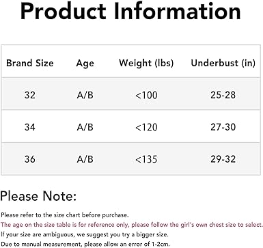• Description: This set is Wireless-Wirefree back closure bra featuring adjustable straps and concealing petals inside cup for no show-through. Bras are comfy-Breathable, super soft material to ensure a comfy and free day so she can concentrate on having fun without having to constantly adjust. They are Fitted-slightly padding and doesn’t enhance too much. It is super great for when the tweens are too big for beginner but too small for cups. This set of Bras are Safe-Made with safe dyes and no harsh chemicals. Great for sensitive skins, sensory issues and active kids. They are Confident-Help ease her discomfort and give her some confidence. Perfect starter bras for school, sports, dance class, and around the house.