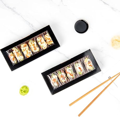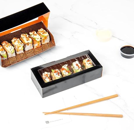 • Description: A sleek way to do TAKEOUT Sushi! This elegant sushi-to-go box is a sophisticated alternative to traditional takeout sushi boxes. It comes in the perfect size. At 8 inches by 3.5 inches, these sushi boxes are ample enough to package mid-sized sushi orders of every kind. The boxes are durable and dependable as they are made from quality paper materials, these boxes are sturdy and strong. These Sushi Boxes come with clear window. It is a large rectangular window to showcase your finest sushi orders. Sushi Boxes are sold in bulk. For convenience and affordability, these takeout sushi boxes are shipped in a 200-count box.