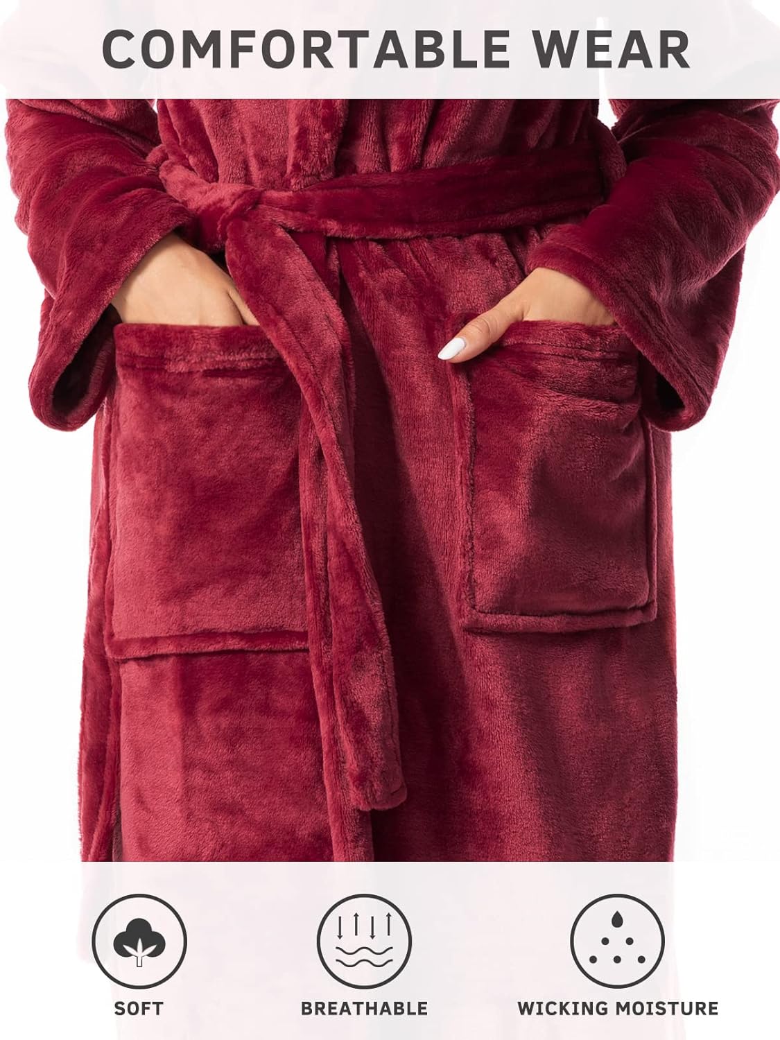• Description: This favorite robe gives you the perfect combo of warmth and lived-in 8comfort.Womens Kimono Fleece Bathrobe This long robes for women and men are made with high-quality flannel fleece material, which is super thick, soft, and lightweight but durable so it will not lose its color and shape even after repeated washing.Robe for Women:Our kimono bathrobe has a high water absorption, This plush robe conveniently features two large pockets in the front. These pockets are perfect to keep your hands warm or to keep items close by your side while lounging around the house. Plush Long Warm Robe: