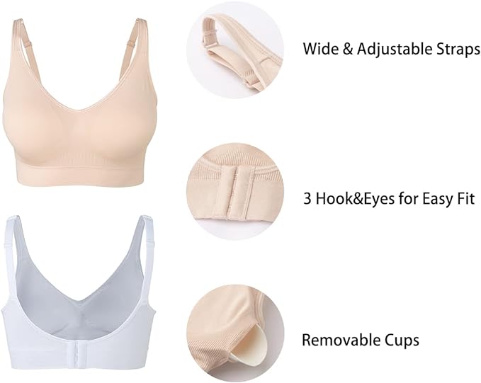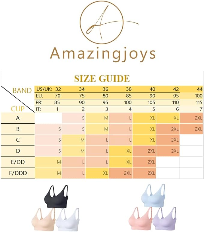 Description: Four way Stretch Fabric Bras. The stretch fabric provides a flexible fit that shapes to fit you ( 90% Nylon,10% Spandex). They are Wireless and Seamles, completely wireless design and the seamless Construction provide maximum comfort and give you a smooth look under clothes. Bra features removable Cups. Removable Unlined cups are so lightweight you’ll forget you’re wearing a bra. Bras are Wide Straps. The Wide comfort adjustable straps stay in place for all day comfort. The bras come with Wide Band Elastic wide band hem for 360 degrees of comfort and provide support for your bust. 3 hook & eyes for easy fit for daily wearing.